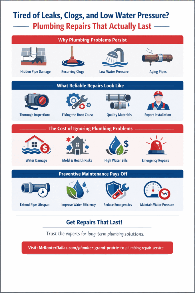 Leaky pipes, stubborn clogs, and weak water pressure are more than everyday annoyances—they interrupt routines, waste water, and can quietly damage your home. Many homeowners deal with repeated plumbing issues because quick fixes only treat symptoms, not causes. That’s why choosing a reliable plumber Grand Prairie homeowners can depend on for lasting repairs is more important today than ever.